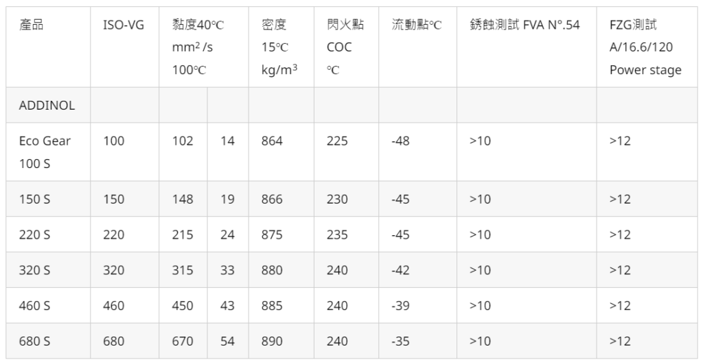 ADDINOL Eco Gear S系列產品不含矽利康。此種高性能傳動油製造時主要採用合成要素(PAO)與特殊添加劑(Surftec-奈米技術)。