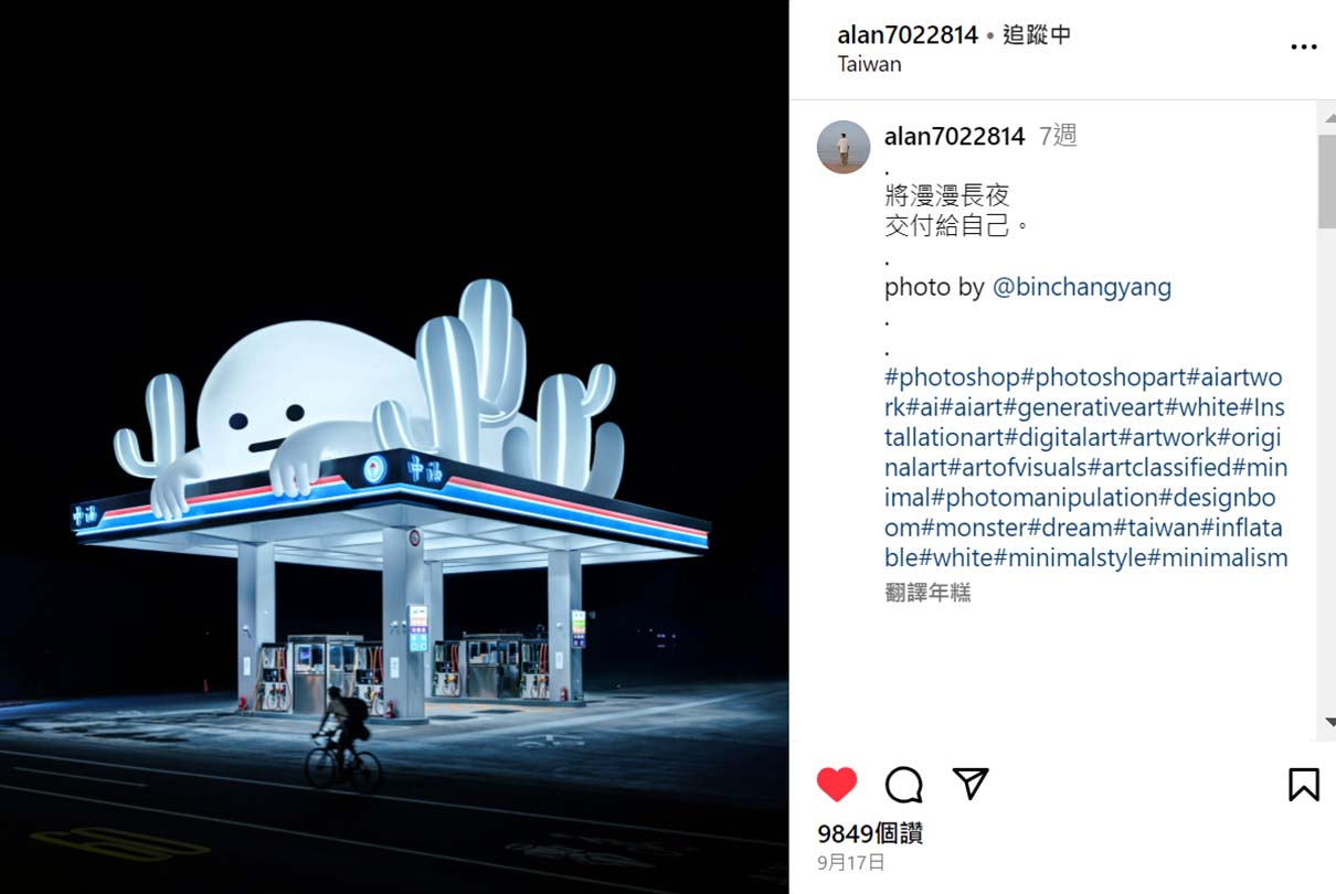 本篇就是看到網路上轉載自,國內新銳設計師Alan Hong ,所運用AI技術與專業攝影的結合,創造出帶有創意作品的展現,Alan Hong 結合白色雲朵般的怪獸,外型有如白色充氣膨脹的圓呼呼的小怪獸,搭配中油CPC國光牌加油站的夜景,趴在加油站上顯得非常的可愛與療癒,有種寂靜感卻又不失與生活周遭的連結,讓眾多網友看了都不僅大讚直呼,「太可愛了!」,「有沒有開放這種加油站加盟!」,「好想把他的系列作品留存當成手機桌布!」等眾多引起共鳴的留言響應。