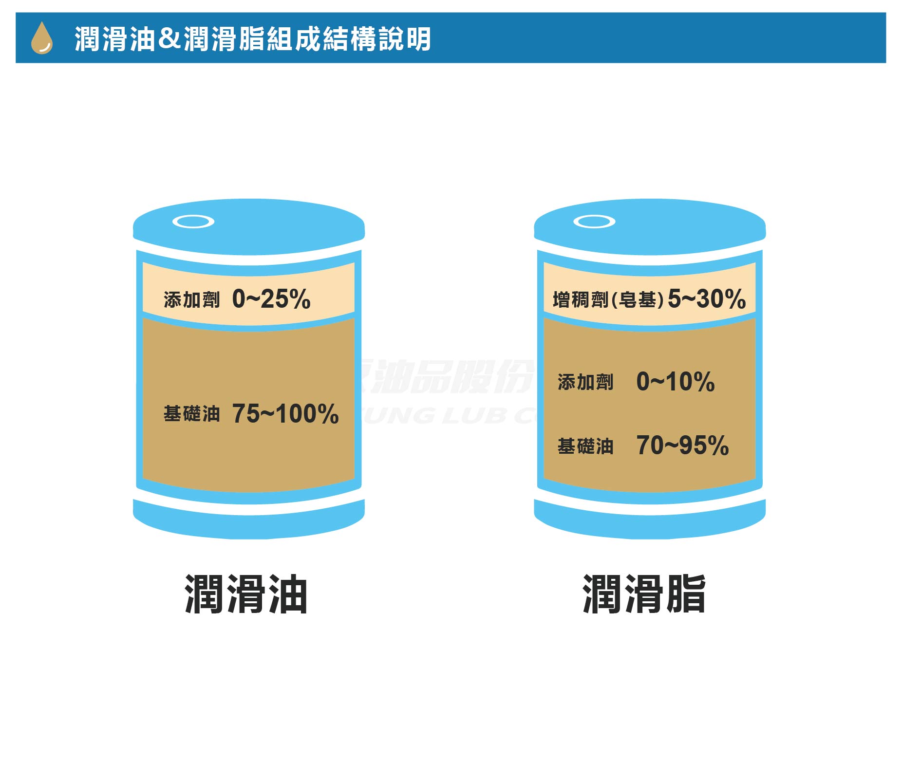 前面談到工業用油與車輛用油的概略組成說明,就是讓大家有所認識,關於工業用潤滑油與車輛用油也是由基礎油+添加劑組成的,本次要談到的是較整體的概述說明,關於潤滑油與潤滑油脂(本文均簡稱:潤滑脂)這兩者,都是透過基礎油加入各式添加劑或增稠劑等的組成,故以下可透過圖解更容易清楚明白地,知道各式潤滑油&潤滑脂的組成成分結構: