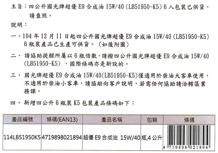 國光牌超優E9合成機油15W40 4L-新包裝上市