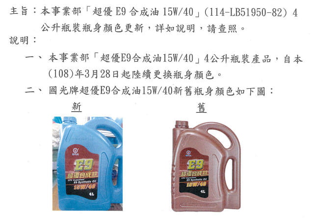 國光牌超優E9合成油15W/40 (114-LB51950-82) 4公升瓶裝瓶身顏色