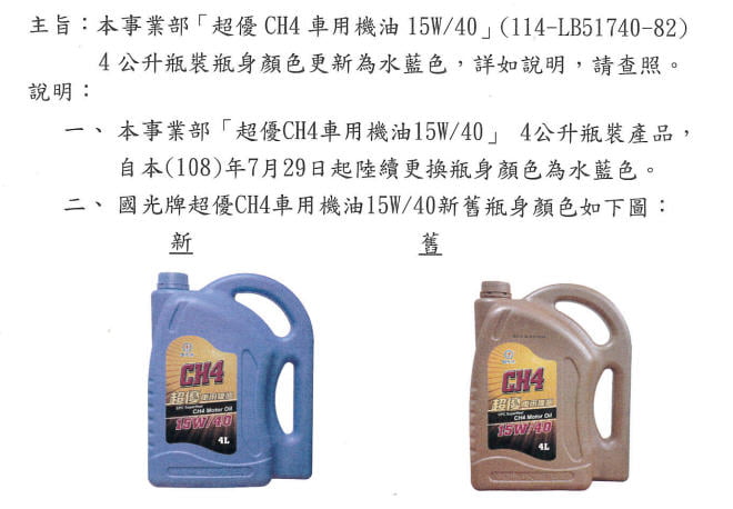 國光牌超優CH4車用機油15W/40(114-LB51740-82) 4公升瓶裝瓶身顏色更新通知