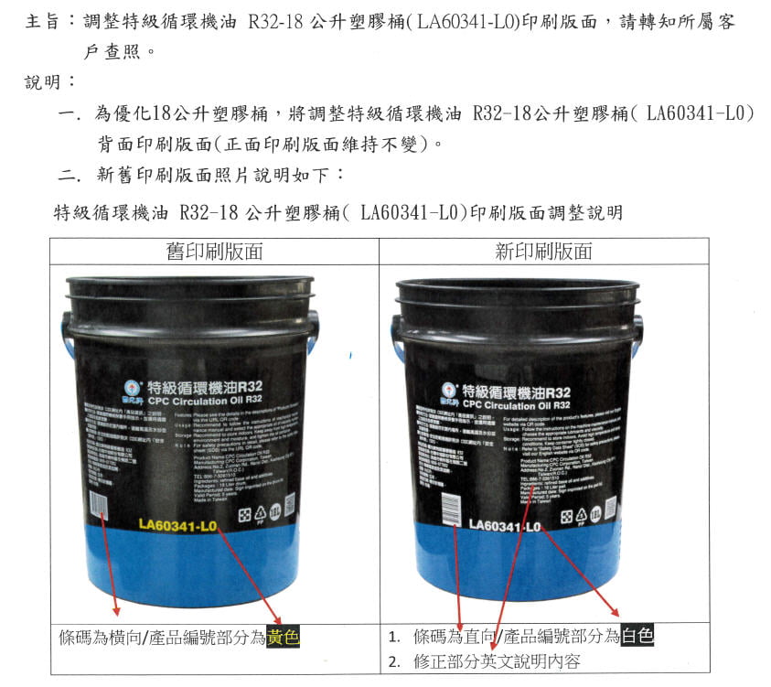 國光牌循環機油R32 18L包裝-印刷版面內容調整通知