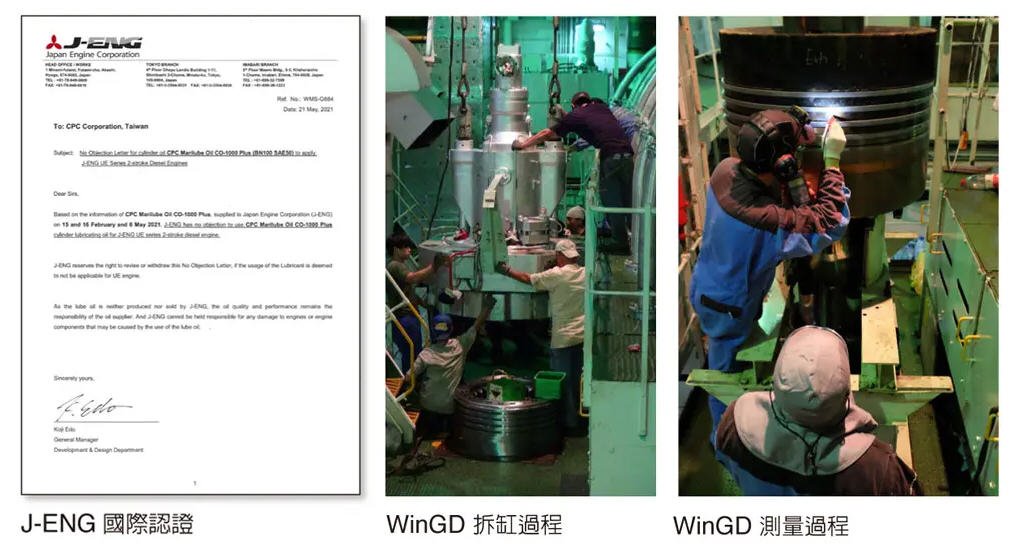 J-ENG公司為日本神戶柴油引擎(Kobe Diesel)和三菱重工船用機械船用引擎(Mitsubishi Heavy Industries Marine Machinery)合併之日本引擎製造公司,欲取得J-ENG國際認證,除了須通過日本各項嚴格的數據測試規格外,更重要的是必須再通過全球市占率第一之丹麥MAN ES公司及瑞士WinGD之國際認證。為取得國際大廠的信任及支持,台灣中油海運團隊過去多次往返丹麥MAN ES及瑞士WinGD研發總部,進行國光牌產品技術、摻配工廠及公司背景等資訊交流及技術研討會議;其中尤以WinGD認證過程最為艱辛,海運團隊除遠赴美國洛杉磯進行初始拆缸外,又奔赴新加坡進行期末拆缸、測量及復位等項目,實船測試總時數達4,000小時以上,通過層層關卡及嚴格測試要求,方能取得認證。
